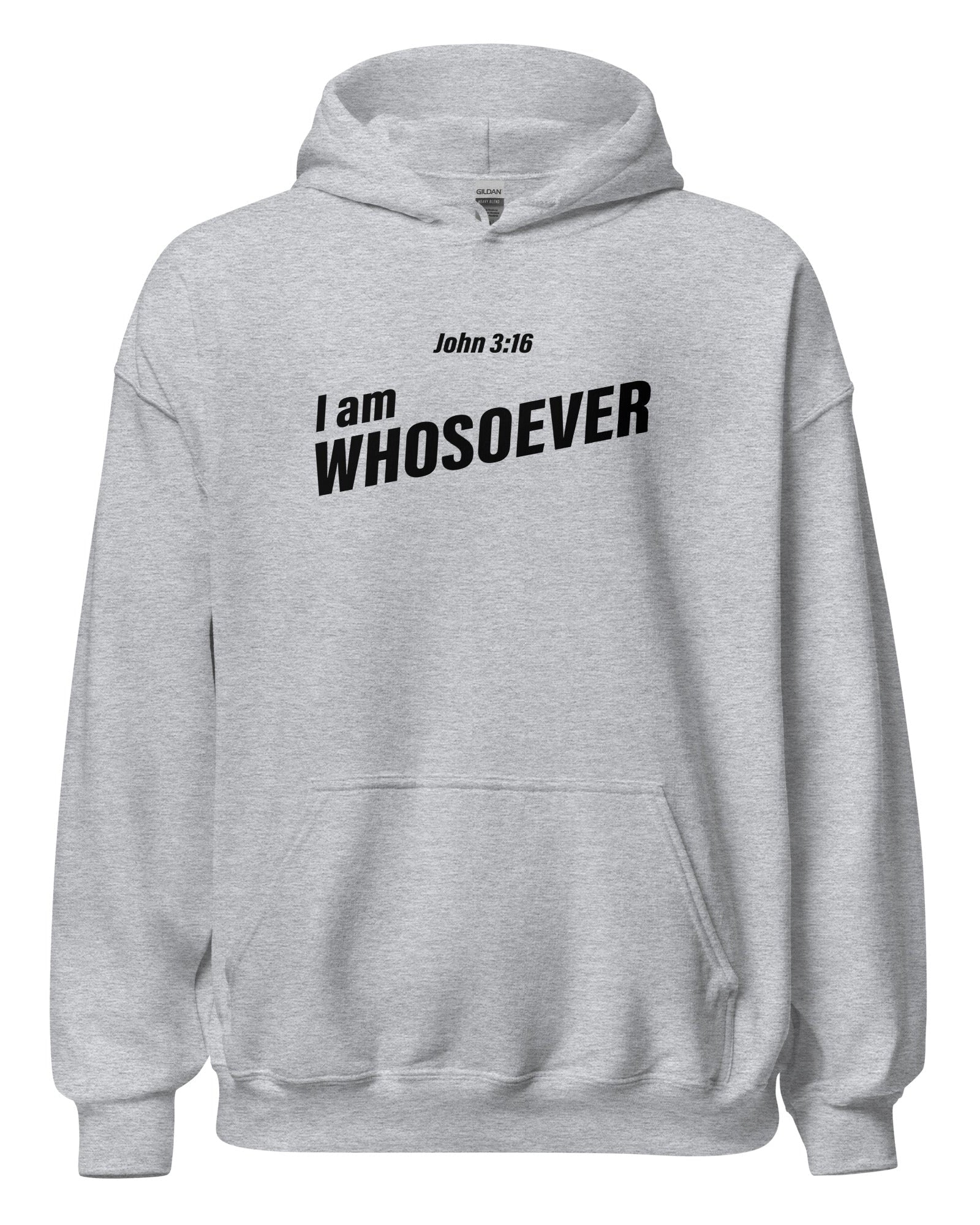 John 3:16 unisex pullover hoodie. " I am whosoever" (on the front) For God so loved the world that He gave His only begotten Son, that whosoever believes in Him should not perish but have everlasting life. Go-to hoodie to curl up in, so go for one that's soft, smooth, and stylish. It's the perfect choice for cooler evenings!
