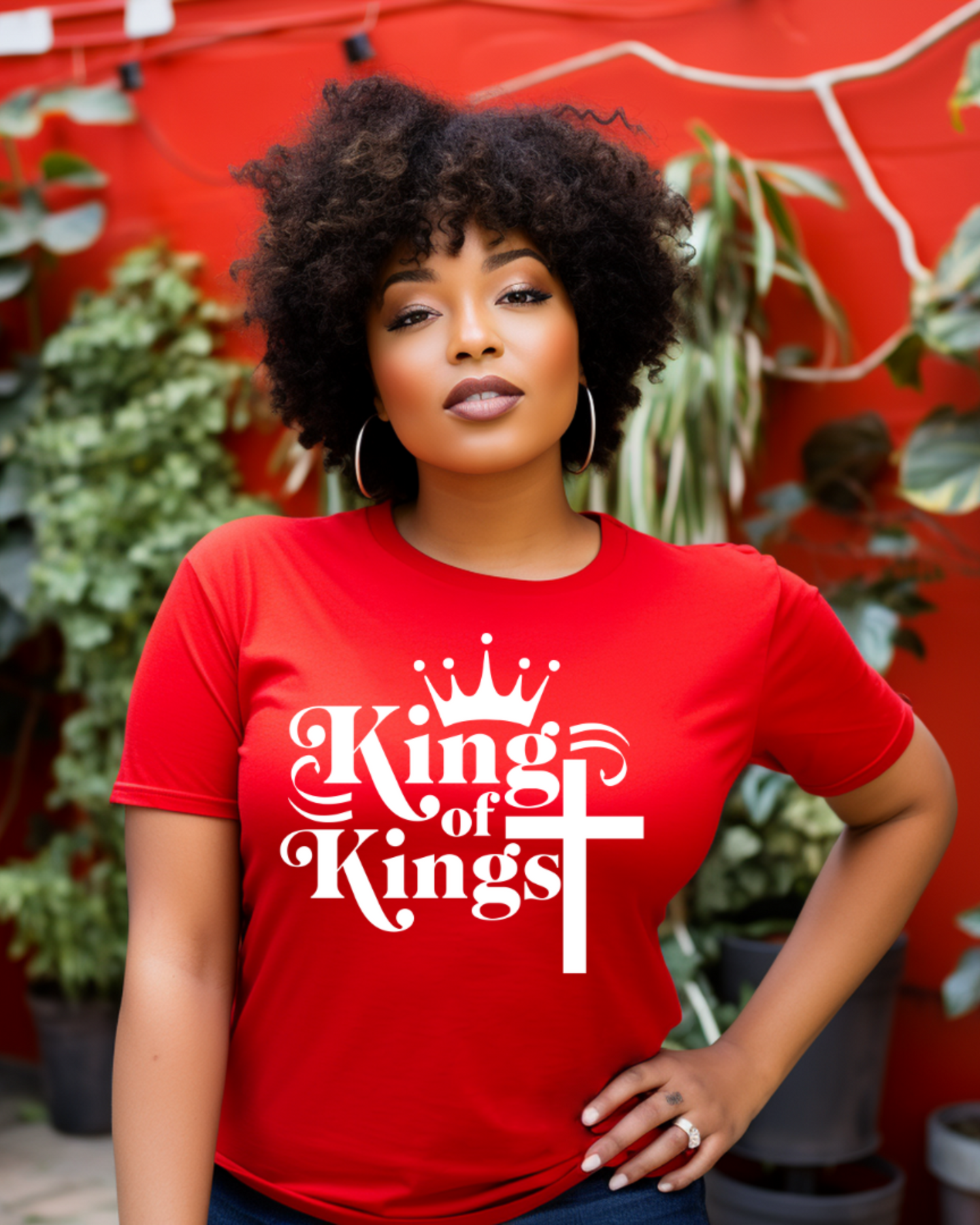 Elevate your wardrobe with our "King of Kings" tee- a powerful reminder of Jesus sovereignty and unmatched authority. The design message is impactful.